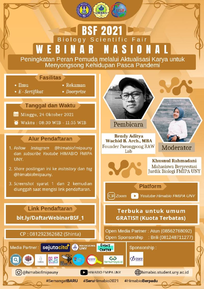 Halo semuanya! Pemuda sebagai agen penggerak memegang tongkat estafet bahkan perjuangan dalam pembangunan bangsa. Hal ini menunjukan harapan besar di tangan pemuda. Maka dari itu untuk bisa mempersiapkan diri, Himabio FMIPA UNY melalui Biology Scientific Fair 2021 akan mengadakan Webinar Nasional.