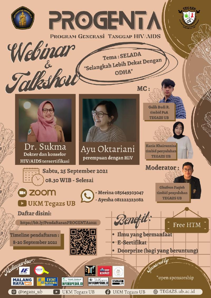 Unit Kegiatan Mahasiswa Tim Penanggulangan Penyalahgunaan NAPZA dan HIV/AIDS Universitas Brawijaya, kembali menghadirkan webinar PROGENTA (Program Generasi Tanggap AIDS) 2021. Pastinya webinar kali ini akan menghadirkan narasumber super keren yang dapat menambah wawasan kalian semua