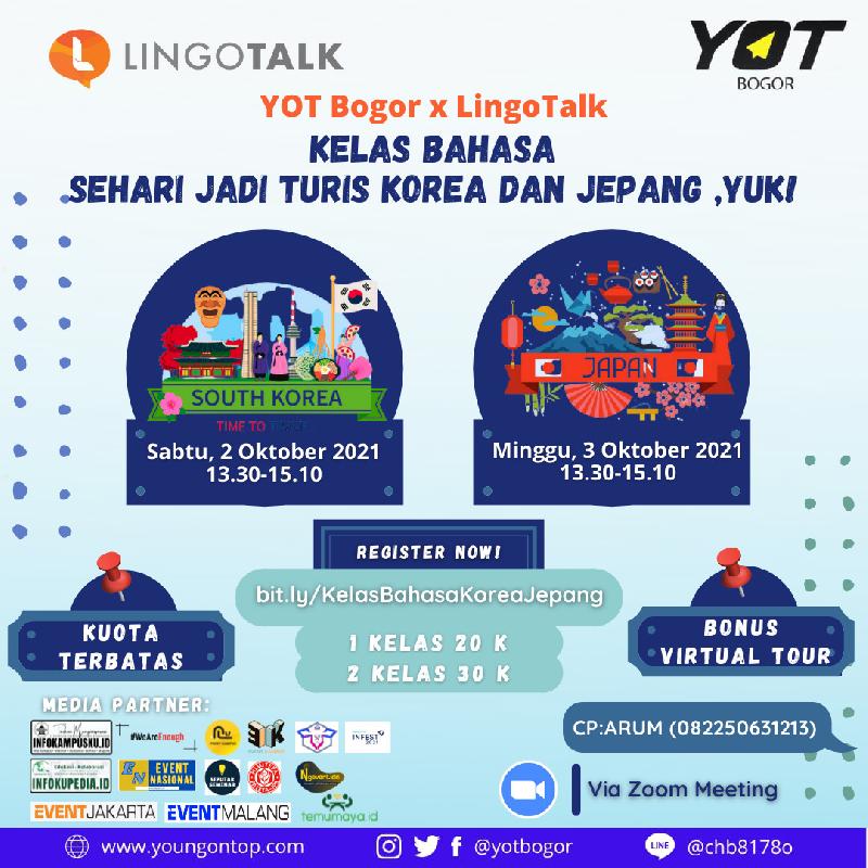YOT Bogor bersama dengan LingoTalk mengadakan Kelas Bahasa dengan tema "Sehari Jadi Turis Korea dan Jepang, Yuk!". Selain bisa menambah skill berbahasa, kamu juga bisa menambah pengetahuan seputar budaya di negara Korea dan Jepang melalui Virtual Tour, lho. Keren banget kan? Yuk, belajar bersama kami!