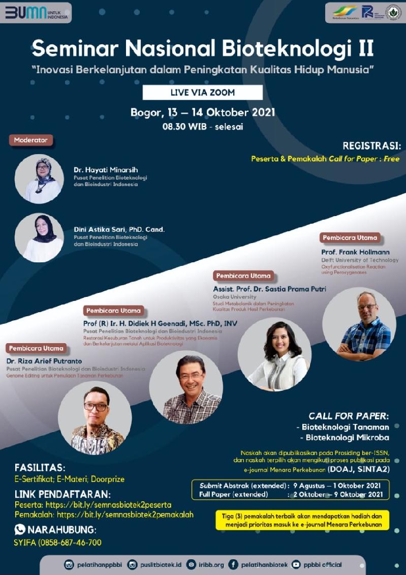 Saat ini bioteknologi terus berkembang pesat, ilmu ini tidak hanya menawarkan solusi pemenuhan kebutuhan manusia, namun sekaligus pemecahan terhadap permasalahan pangan, energi dan lain sebagainya secara inovatif dan berkelanjutan. Sebagai Pusat Ungguln IPTEK Bioteknologi Perkebunan, Riset Perkebunan Indonesia - Pusat Penetian Bioteknologi dan Bioindustri Indonesia (PPBBI) dalam waktu dekat ini akan menyelenggarakan :