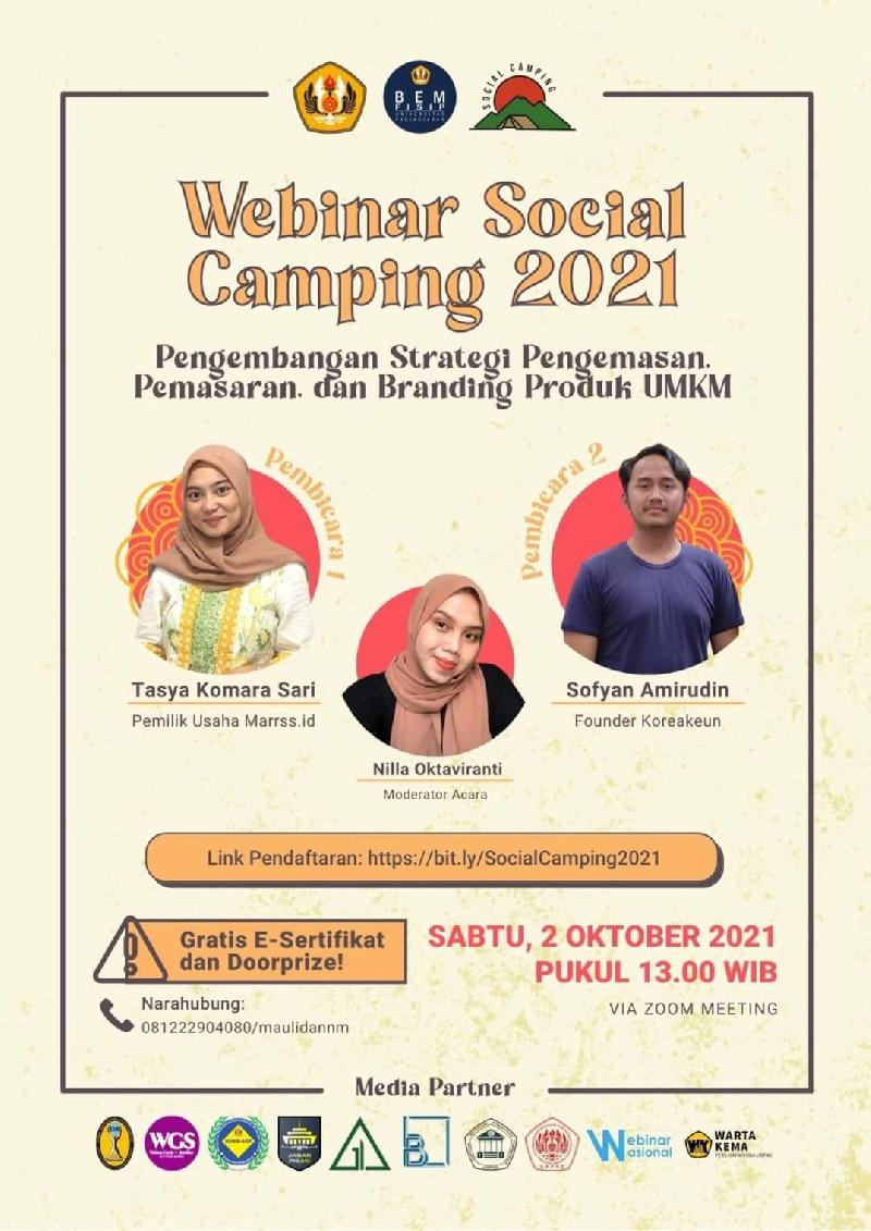 Social Camping 2021 pada kesempatan kali ini akan mengadakan webinar UMKM mengenai "Pengembangan Strategi Pengemasan, Pemasaran, dan Branding Produk UMKM".