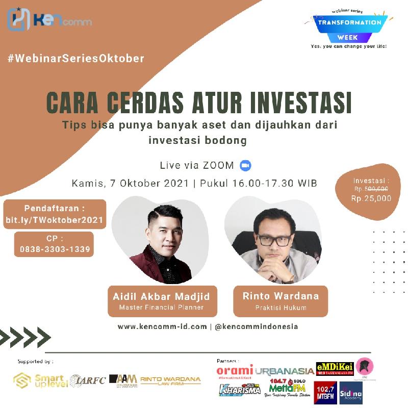 Kalau kamu pengen banget cari tahu gimana caranya bisa investasi dengan gaji UMR, dan cara yang cerdas agar tidak sampai tertipu investasi abal-abal, disinilah saat yang tepat. Kamu juga bisa cari tahu apa yang bisa dilakukan kalau sudah terlanjur nyemplung di investasi bodong. Yuk cari ilmunya bersama pakar finansial dan praktisi hukum di acara Webinar Series Transformation Week dari @kencommindonesia.