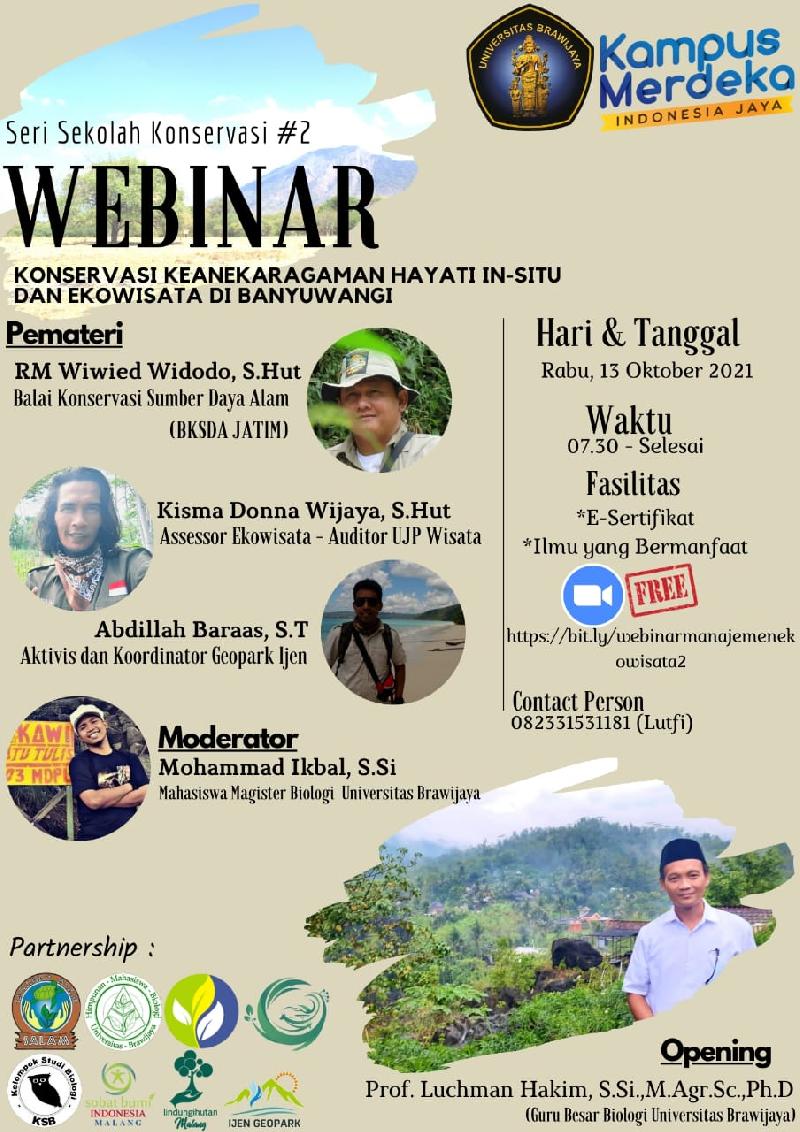 Ekowisata memiliki pengaruh terhadap konservasi alam dalam bentuk pemeliharaan, kelestarian, dan mengembangkan keberagaman hayati di wilayah ekowisata khususnya Banyuwangi. Untuk itu Magister Biologi Fakultas MIPA Universitas Brawijaya. kali ini mempersembahkan webinar dengan mengangkat tema " Konservasi Keanekaragaman Hayati In - Situ dan Ekowisata di Banyuwangi”.