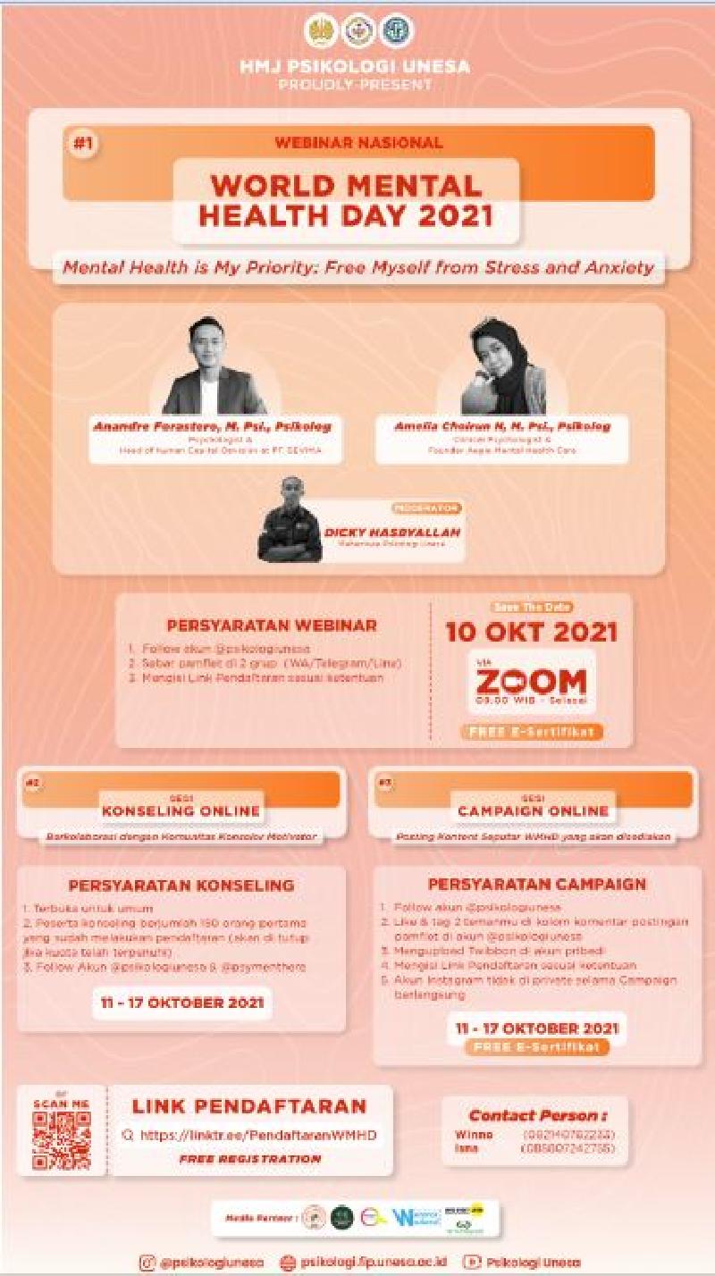 ada serangkaian program menarik yang kita suguhkan dalam rangka memperingati World Mental Health Day tahun 2021 ini lho. Bersama HMJ PSIKOLOGI UNESA kita akan mengajak dan mengedukasi kepada seluruh lapisan masyarakat dan kalangan muda maupun tua tentang pentingnya menjaga kesehatan mental.