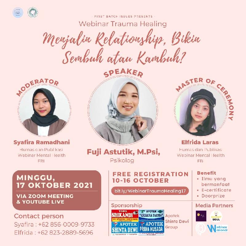 Jadi untuk memperingati World Mental Health Day, Paragotral FBI mengadakan acara webinar yang berguna untuk meningkatkan kesadaran kita akan pentingnya kesehatan mental terutama trauma healing akibat toxic relationship. Then you must join us on :