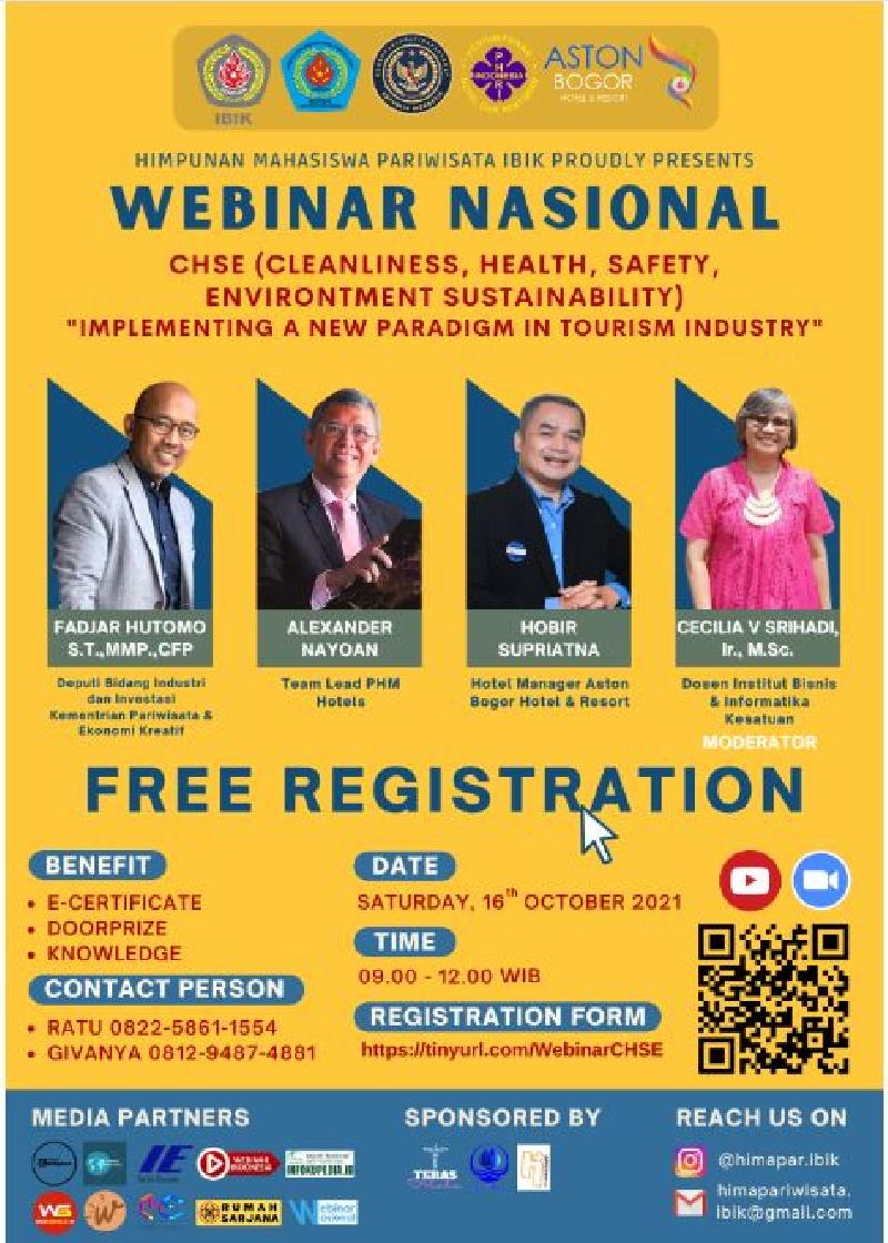 Di era pandemi ini seluruh aktivitas dan kegiatan diatur sebagai mestinya mengikuti peraturan yang sudah disediakan oleh instansi pemerintah. Khususnya dalam kegiatan berwisata munculah paradigma baru bahwa semua orang yang ingin melakukan kegiatan pariwisata harus memerhatikan kepentingan akan kebersihan dan juga keselamatan mereka. Untuk itu kami mengadakan webinar nasional dengan tema CHSE (Cleanliness, Health, Safety, Environment) sebagai pedoman baik pelaku wisata dan ekonomi kreatif dan juga masyarakat yang akan melakukan kegiatan pariwisata di era new normal ini.