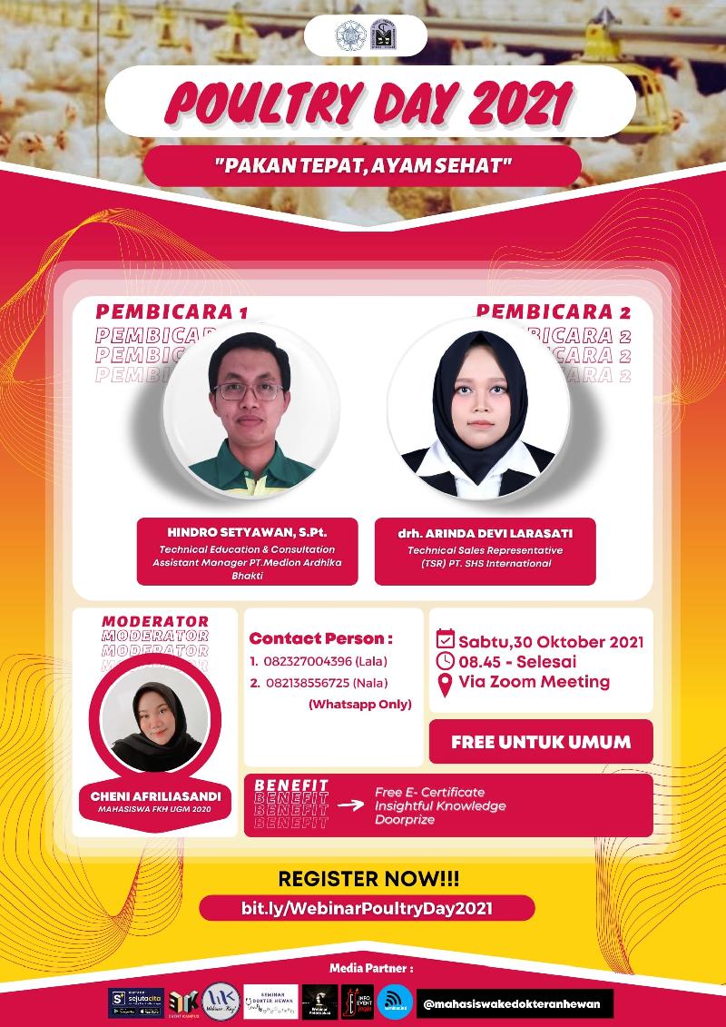 Divisi Unggas Himpunan Studi Ternak Produktif (HSTP) Fakultas Kedokteran Hewan UGM mempersembahkan Webinar Poultry Day 2021 dengan mengangkat tema “Pakan Tepat, Ayam Sehat” dan dua subtema yang menarik yaitu “Manajemen Pakan Ayam Layer pada Peternak Mandiri” dan “Meningkatkan Efisiensi Layer melalui Kontrol Kesehatan”