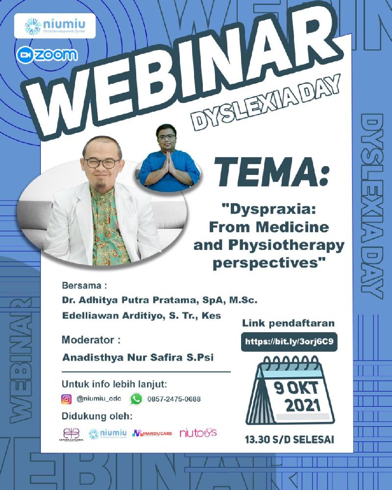 Dalam rangka memperingati hari disleksia, kami mengadakan webinar untuk memahami lebih mendalam lagi terhadap kondisi tersebut. Ikuti webinar bersama dokter Spesialis anak dan fisio terapis anak niumiu child development center