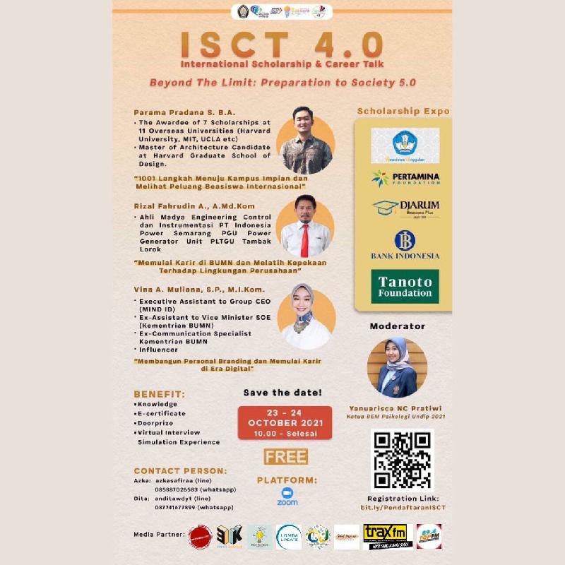 Kesma Bem Undip 2021 dengan bangga mempersembahkan International Scholarship & Career Talk 4.0. Pada webinar beasiswa dan karir kita kali ini mengusung tema yang sangat menarik yaitu "Beyond The Limit : Preparation to Society 5.0".