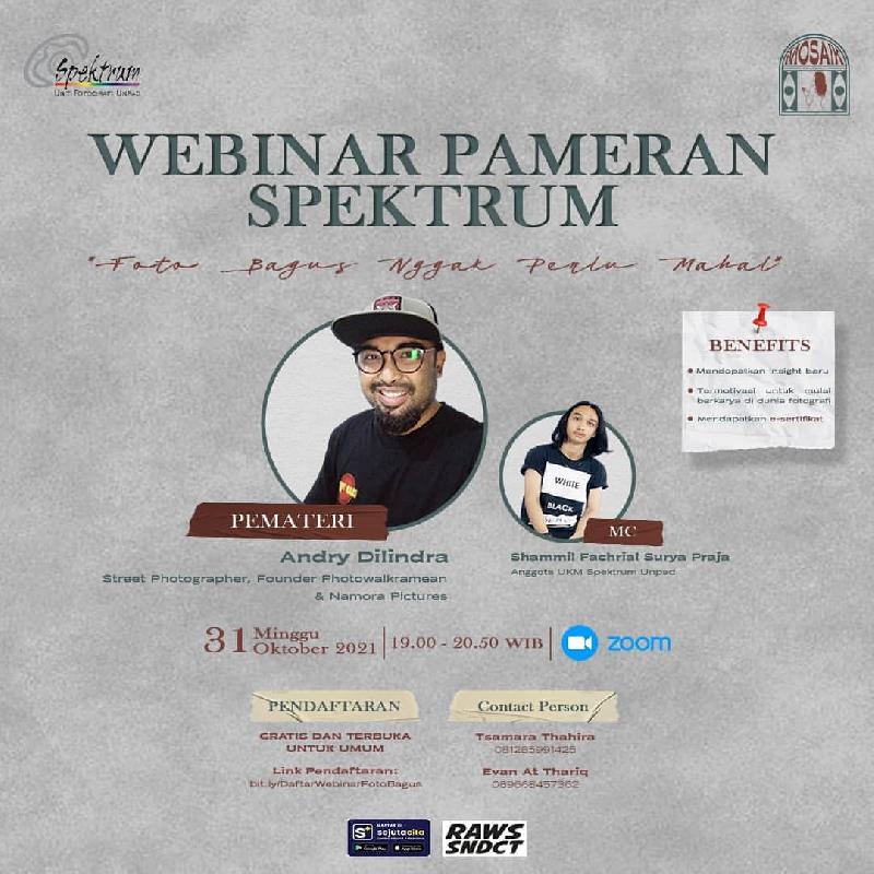 Dan untuk seluruh peserta Lomba Fotografi Nasional Spektrum Unpad 2021 akan kami undang untuk menghadiri webinar ini karena akan ada pengumuman pemenang lomba! So, jangan lupa untuk daftar dan hadir ya!