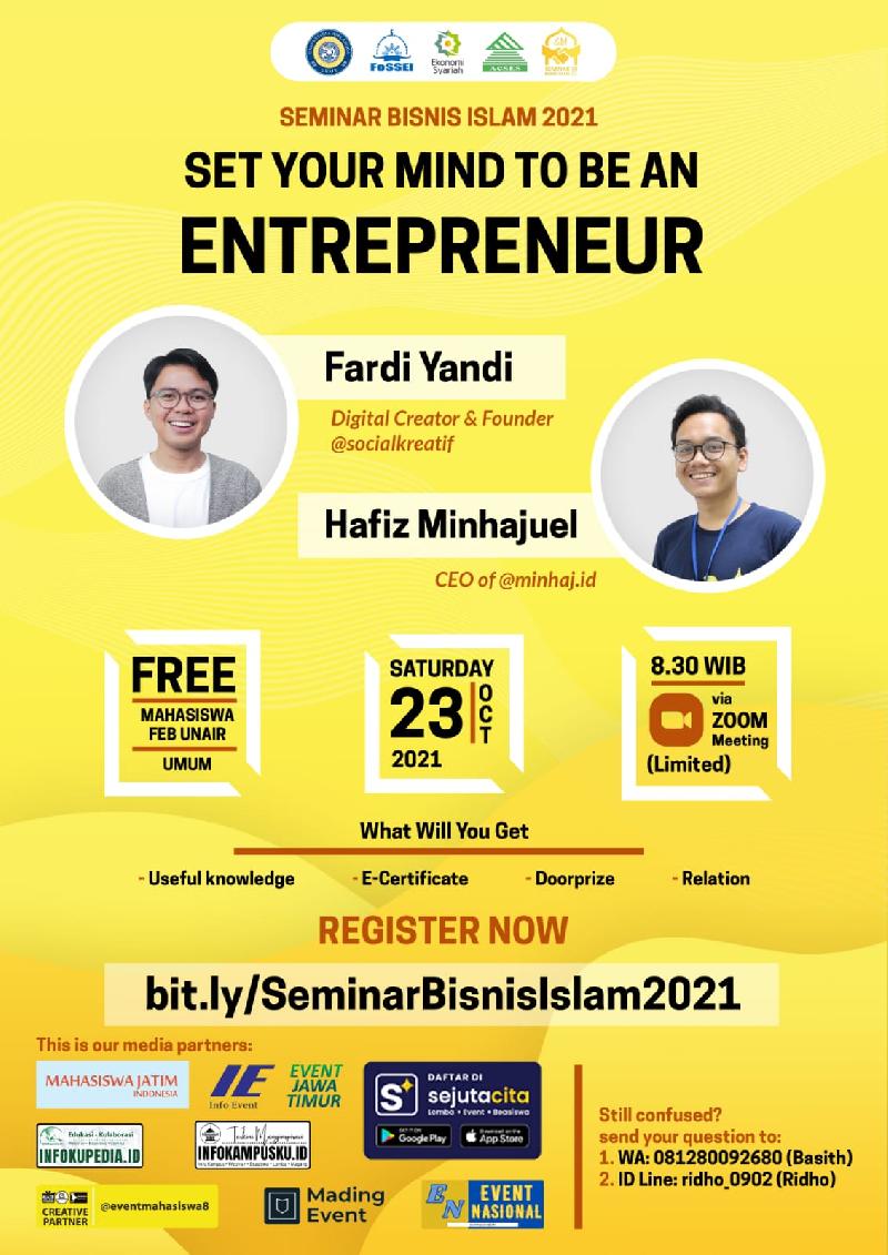 Seminar Bisnis Islam 2021 merupakan sebuah acara yang diselenggarakan oleh AcSES/ Association of Sharia Economics Studies FEB Unair. Seminar ini bertujuan untuk memberikan wawasan mengenai dunia usaha dengan menerapkan prinsip Islam baik secara teoritis maupun praktis Selain itu, seminar ini juga akan membahas mengenai konten digital yang menjadi wadah bagi para entreprenuer dalam menjalankan usaha di Era Society 5.0