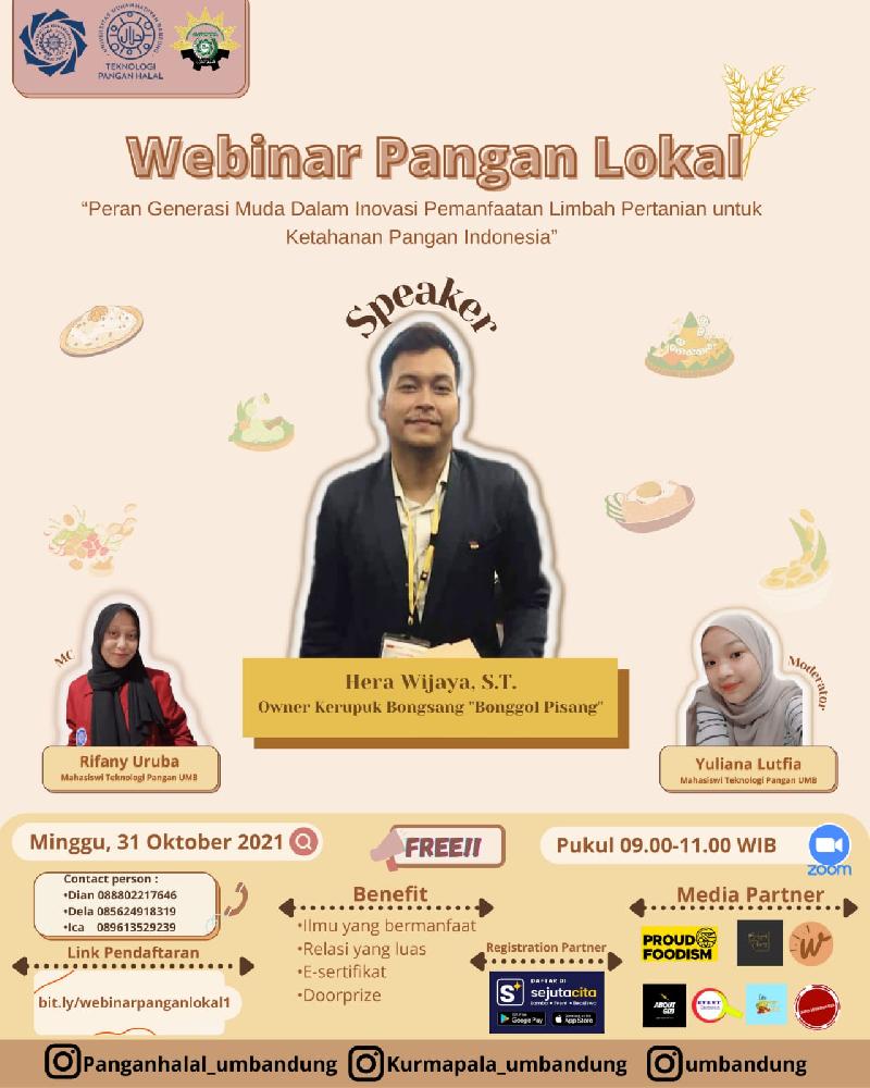 Program Studi Teknologi Pangan Universitas Muhammadiyah Bandung berkolaborasi dengan Keluarga Mahasiswa Teknologi Pangan Halal menghadirkan Webinar untuk memperingati Hari Pangan Sedunia dengan tema "Peran Generasi Muda Dalam Inovasi Pemanfaatan Limbah Pertanian untuk Ketahanan Pangan Indonesia"