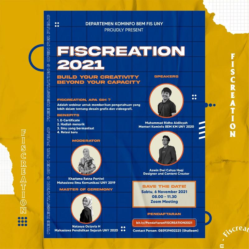 Webinar untuk memberikan pengetahuan yang lebih dalam tentang desain grafis dan videografi. Tahun ini FISCREATION mengangkat tema "Build your Creativity Beyond your Capacity".