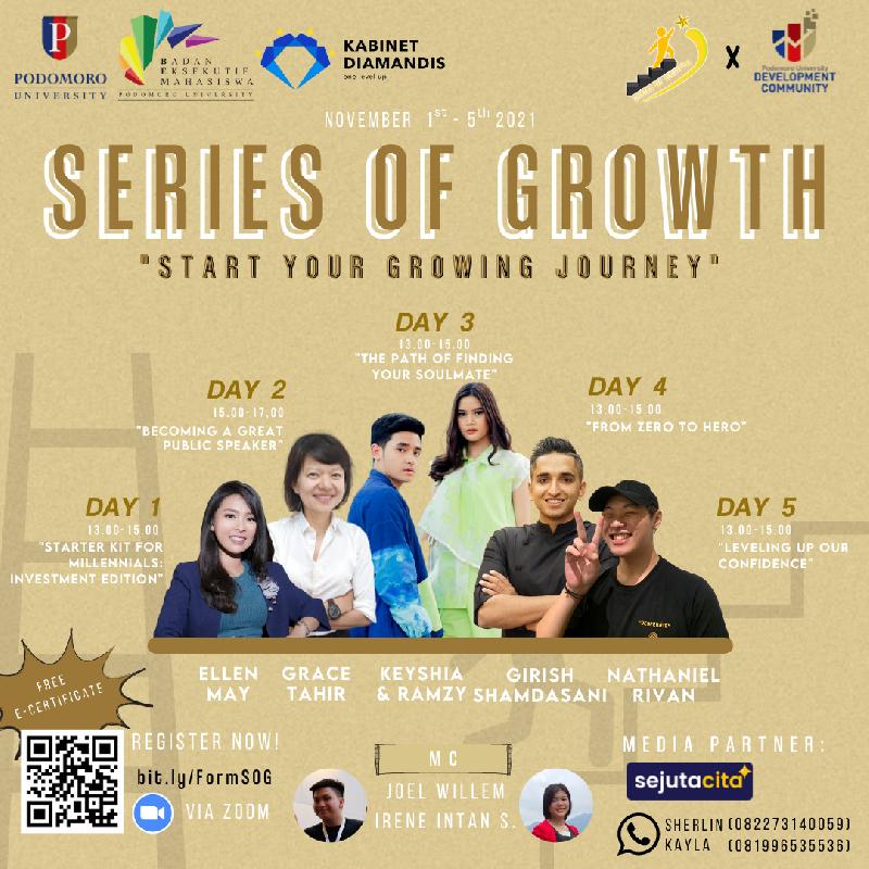 Maka dari itu, Webinar Series of Growth hadir dengan mengangkat topik yang berbeda di setiap webinar yaitu tentang keuangan, public speaking, relationship, usaha, dan kepercayaan diri.
