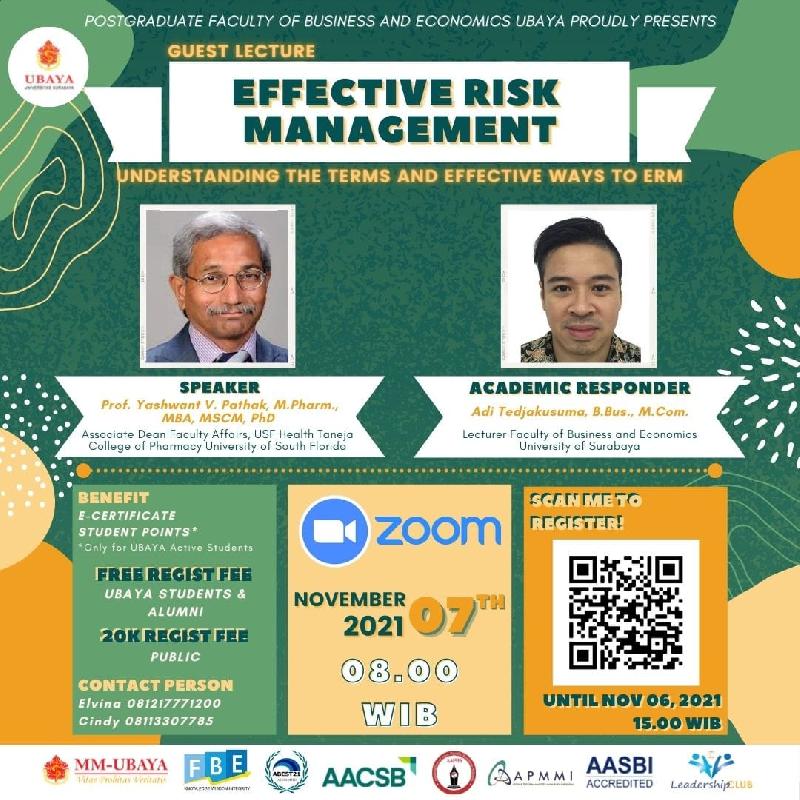 Leadership Club Pascasarjana FBE UBAYA hadir dengan kelas "Effective Risk Management: Understanding the terms and effective ways to ERM" untuk membekali rekan-rekan semua dalam mengantisipasi risiko bisnis dengan menghadirkan pembicara yang ahli pada bidangnya.