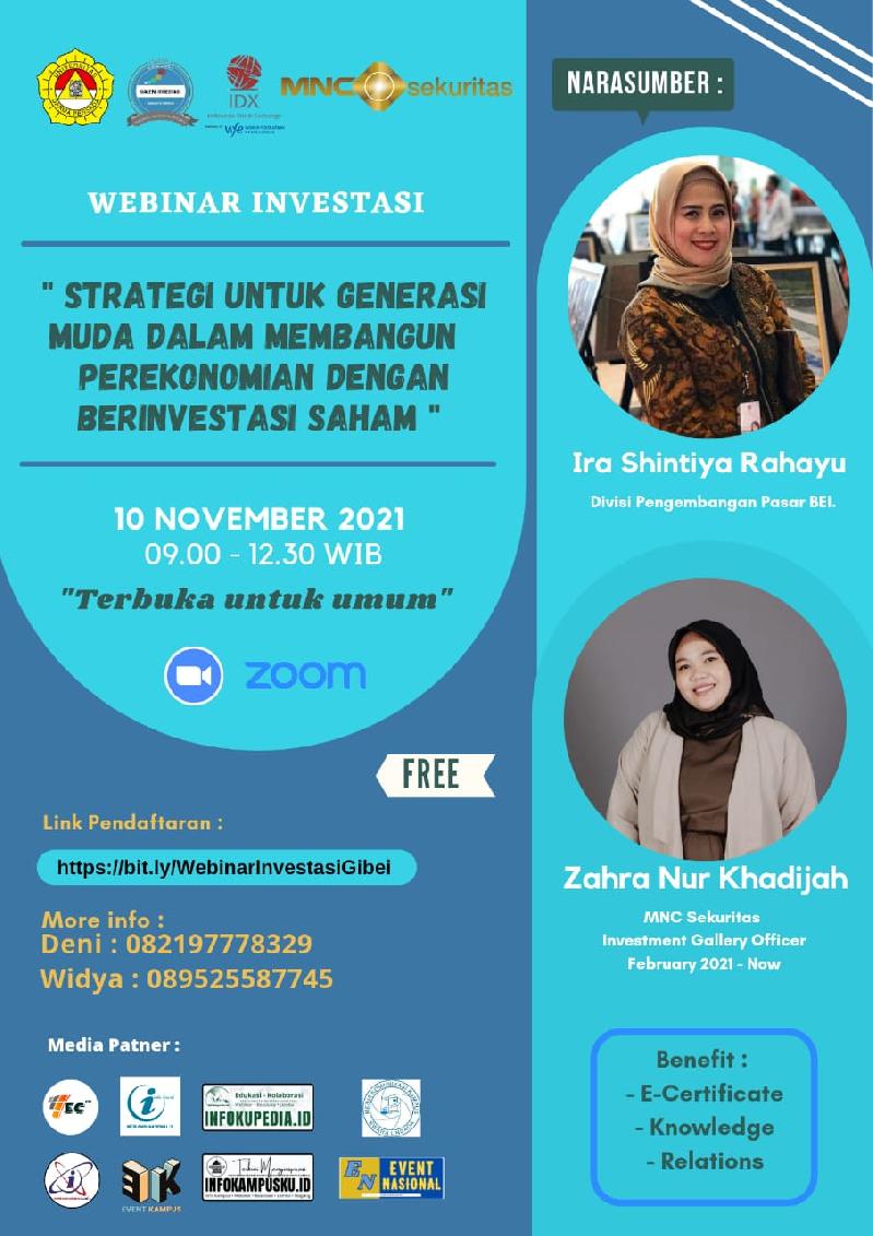 Kali ini GIBEI UNSADA memberikan kesempatan kepada kalian untuk mengenal lebih dalam seputar investasi saham dalam acara Webinar Investasi. Acara ini diadakan secara virtual lho...