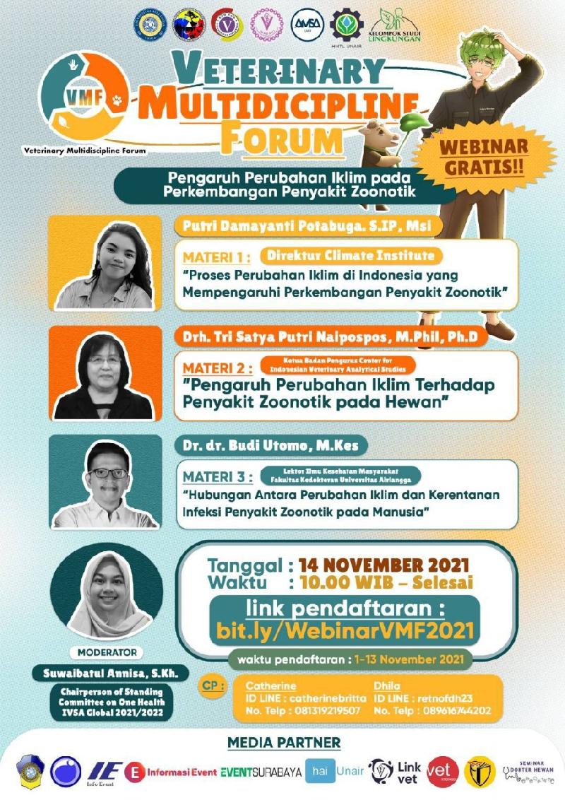 Tema Veterinary Multidiscipline Forum "Pengaruh Perubahan Lingkungan pada Perkembangan Penyakit Zoonotik" akan dibawakan oleh 3 pemateri dari 3 bidang ilmu yang berbeda!