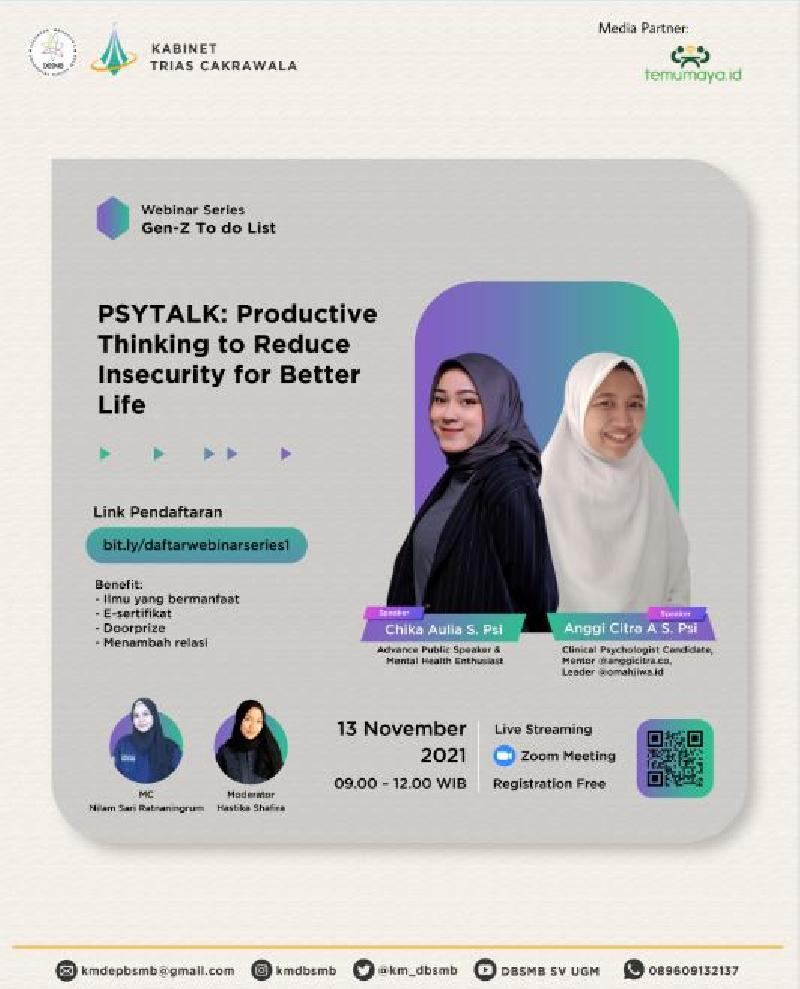 Don't worry be happy, karena divisi SOSMAS KM DBSMB menghadirkan webinar "PSYTALK: Productive Thinking to Reduce Insecurity for Better Life" yang tentunya menarik banget nih buat kita yang mau pede di era gen-Z dalam insecurity.