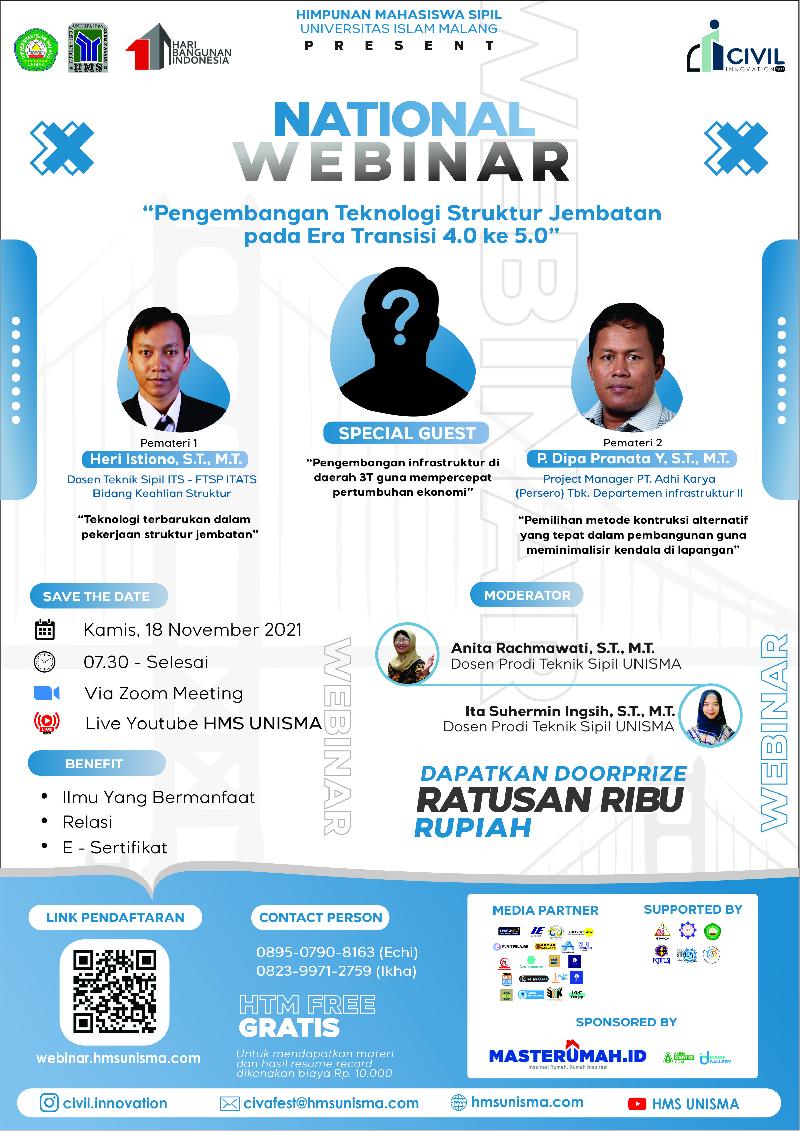 Rangkaian kegiatan Civil Innovation Fest tahun ini salah satunya adalah webinar nasional dengan tema "Pengembangan Teknologi Struktur Jembatan pada Era Transisi 4.0 ke 5.0" .
