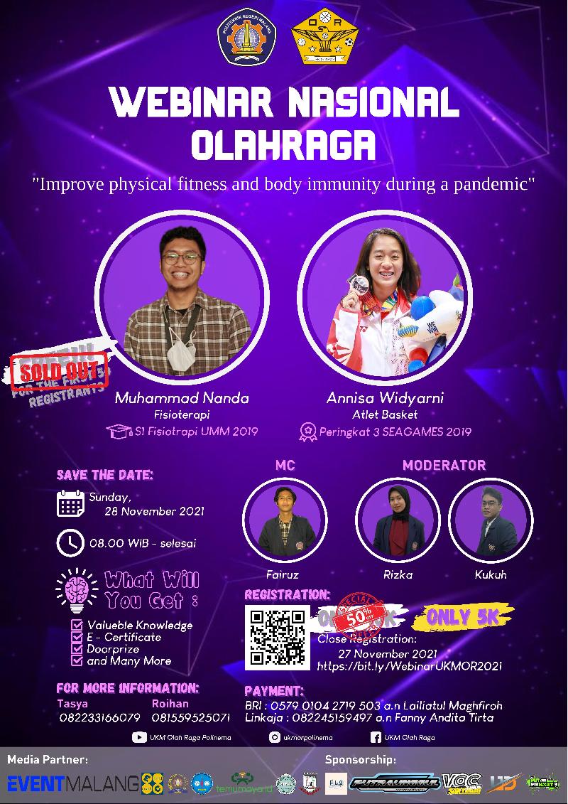 Webinar Nasional Unit Kegiatan Mahasiswa Olah Raga Politeknik Negeri Malang is back!! Dengan mengusung tema “Meningkatkan Kebugaran Jasmani Serta Imunitas Tubuh Dalam Masa Pandemi.”, kabar baik nih! webinar nasional kali ini akan dilakukan secara online!!