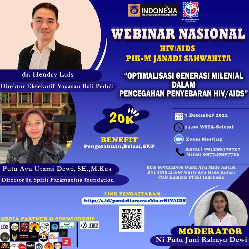 PIK-M Janadhi Sahwahita STIKI Indonesia mempersembahkan Webinar Nasional yang bertemakan " Optimalisasi Generasi Milenial Dalam Pencegahan Penyebaran HIV/AIDS ".