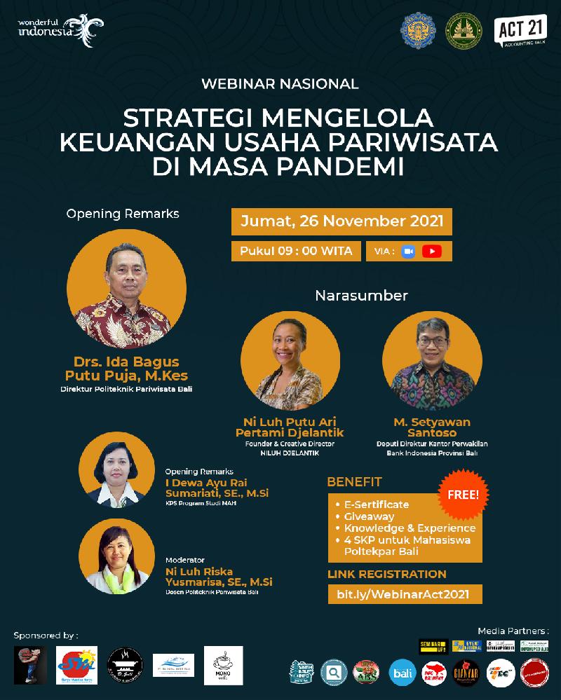 “Accounting Talk” tahun 2021 merupakan webinar nasional yang diselenggarakan oleh program studi Manajemen Akuntansi Hospitaliti (MAH) Politeknik Pariwisata Bali. Accounting Talk 2021 mengambil tema kegiatan yaitu “Strategi Mengelola Keuangan Usaha Pariwisata di Masa Pandemi” yang bertujuan untuk membangun serta mengembangkan jiwa generasi muda khususnya yang memiliki usaha di bidang pariwisata untuk mengelola keuangannya di masa pandemi.