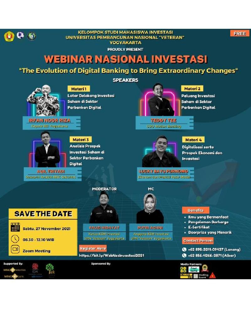 Simak informasi analisis investasi saham sektor perbankan digital dalam acara Webinar Nasional Investasi 2021 dengan tema "The Evolution of Digital Banking to Bring Extraordinary Changes"