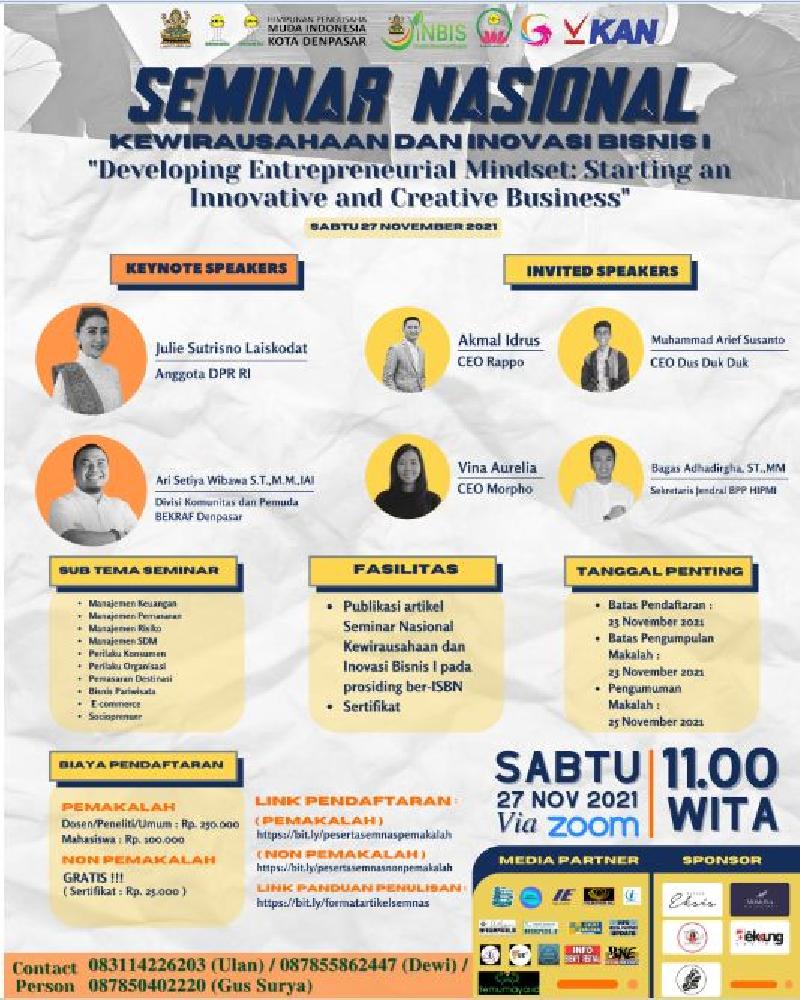 "Untuk mendukung pengembangan pola pikir dan pola perilaku berwirausaha yang kreatif, inovatif dan adaptif sesuai dengan perkembangan aspek digital saat ini, maka Pusat Inovasi dan Inkubator Bisnis - LPPM Universitas Mahasaraswati Denpasar dan Himpunan Pengusaha Muda Indonesia Perguruan Tinggi Universitas Mahasaraswati Denpasar, menghadirkan Seminar Nasional Kewirausahaan dan Inovasi Bisnis I 2021 dengan tema :