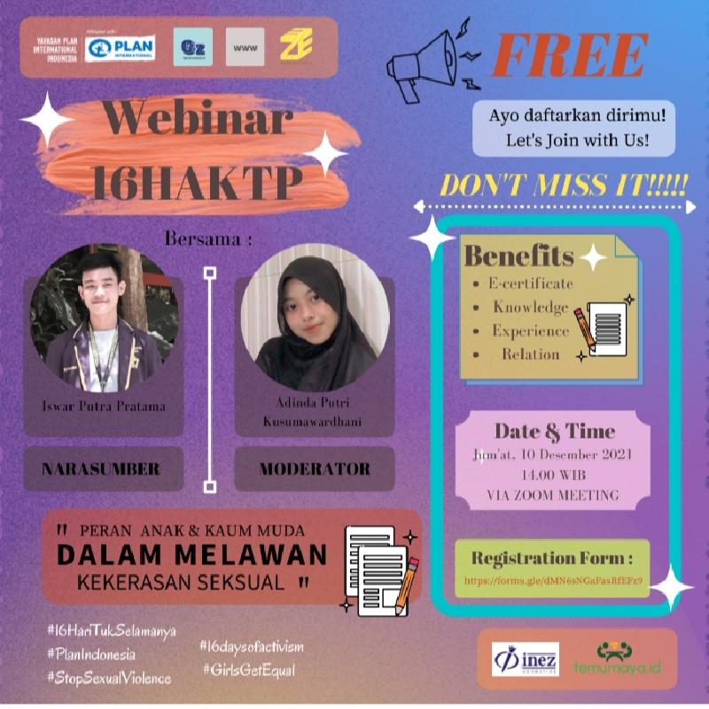 Kasus kekerasan seksual di Indonesia saat ini semakin meningkat.Minimnya pengetahuan dan edukasi terhadap isu kekerasan,merupakan salah satu faktor yang mendorong tinggi nya kasus kekerasan setiap hari.Perempuan serta anak-anak sangat rentan menjadi korban kekerasan.Oleh karena itu kami mengadakan webinar dengan tema "Peran Anak dan Kaum Muda Melawan Kekerasan Seksual".Yang akan dilaksanakan pada :