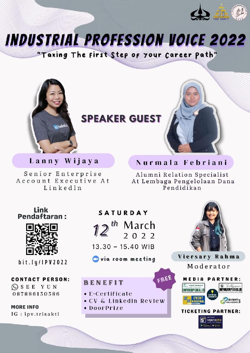 Pada kali ini Industrial Profession Voice 2022 mengangkat tema "Taking The First Step Of Your Career Path", yang merupakan salah satu kegiatan dari Himpunan Mahasiswa Teknik Industri. Tujuan dari kegiatan ini untuk memberikan informasi mengenai cara penyusunan CV dan cara memperluas networking melalui LinkedIn.