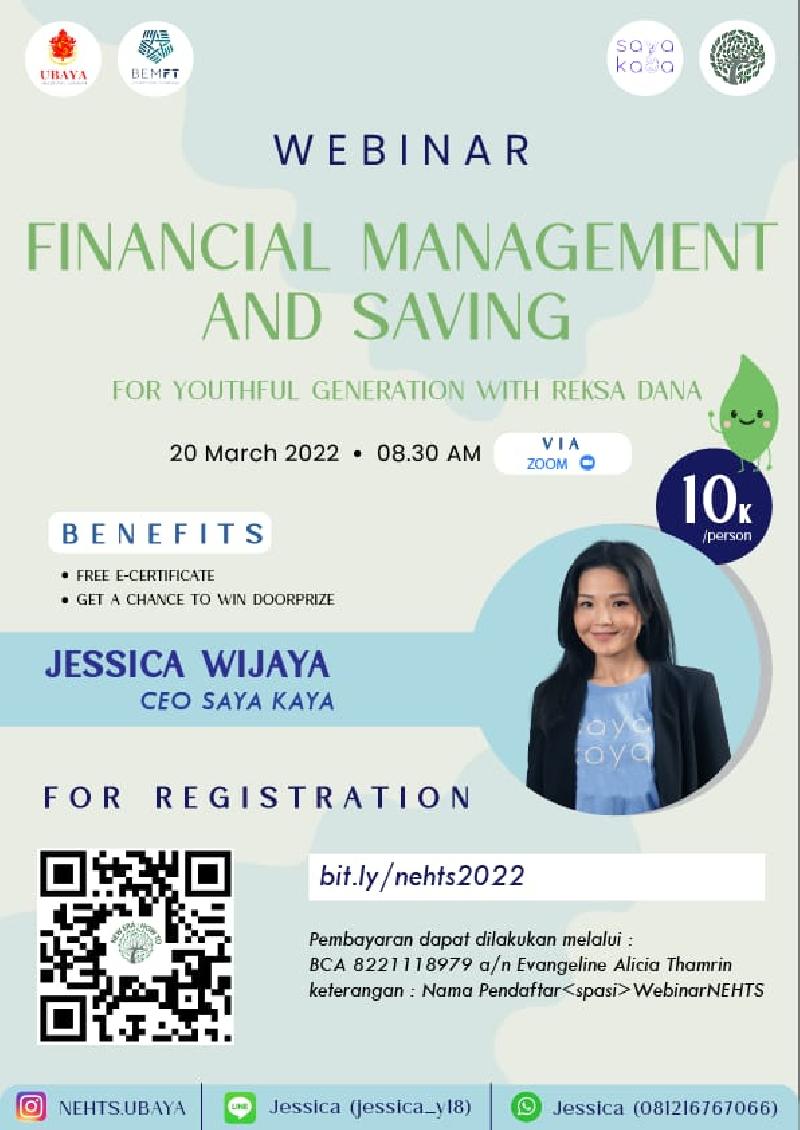 Di Era ini, kebutuhan kaum millenial pastinya sangatlah banyak, sehingga kita harus belajar mengatur keuangan agar tidak boros dan berlebihan. Tentunya tidak hanya untuk saat ini, juga untuk masa depan. Maka dari itu kita perlu mengetahui cara mengatur keuangan dan tabungan mulai dari sekarang. Yuk belajar bareng di Webinar "Financial Management And Saving"