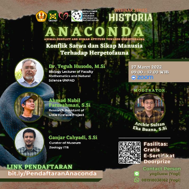 Konflik antara herpetofauna dengan manusia tidak selalu berasal dari satwa liarnya, sehingga dalam webinar ini akan dibahas juga mengenai sikap manusia terhadap herpetofauna yang dikemas dalam judul ANACONDA (Animal Conflict and Human Attitude Towards Herpetofauna).