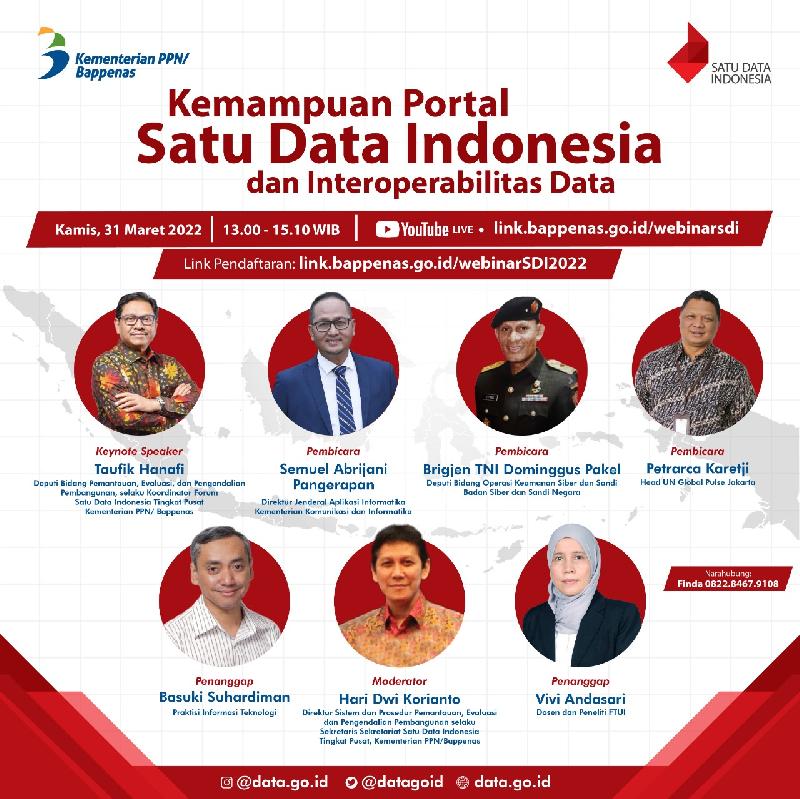 Untuk itu, Sekretariat Satu Data Indonesia Tingkat Pusat, Kementerian PPN/Bappenas mengajak dan mengundang stakeholders dan lapisan masyarakat untuk berdiskusi dalam Webinar Satu Data Indonesia dengan tema: Kemampuan Portal Satu Data Indonesia dan Interoperabilitas Data, yang akan digelar pada: