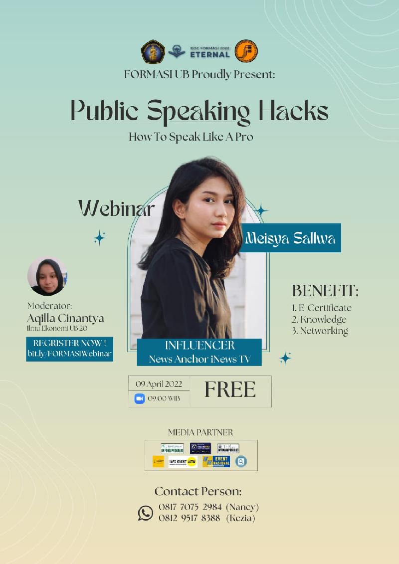 Don’t worry, guys! FORMASI Brawijaya University invites you to learn more about public speaking from an expert through our webinar entitled: