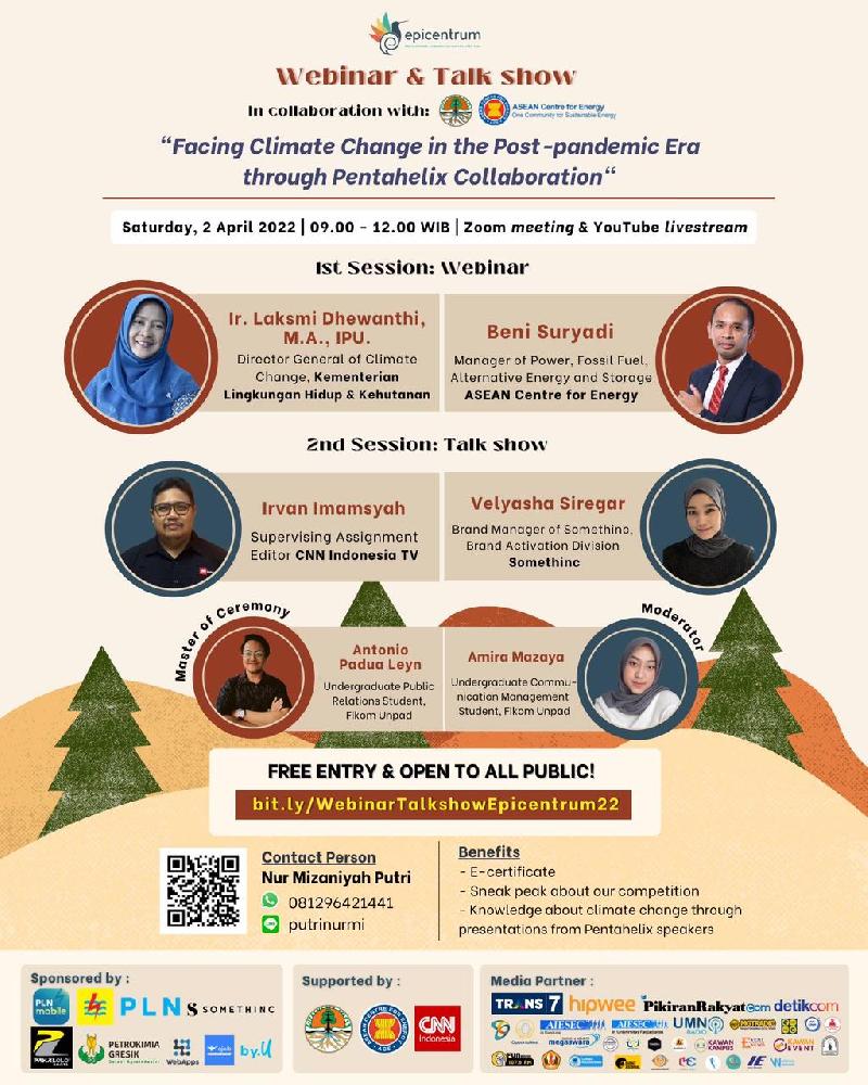 Webinar dan Talk show Epicentrum Fikom Unpad 2022 merupakan kegiatan Pra-event Epicentrum 2022 untuk memberikan pemahaman mendasar dan meningkatkan kesadaran publik mengenai pentingnya permasalahan climate change. Webinar dan Talk show ini mengusung judul “Facing Climate Change in the Post-pandemic Era through Pentahelix Collaboration” dengan membahas bagaimana persiapan, langkah-langkah yang akan diambil, serta kerja sama 5 (lima) unsur pentahelix dalam menghadapi climate change di saat pemulihan Indonesia pascapandemi Covid-19.