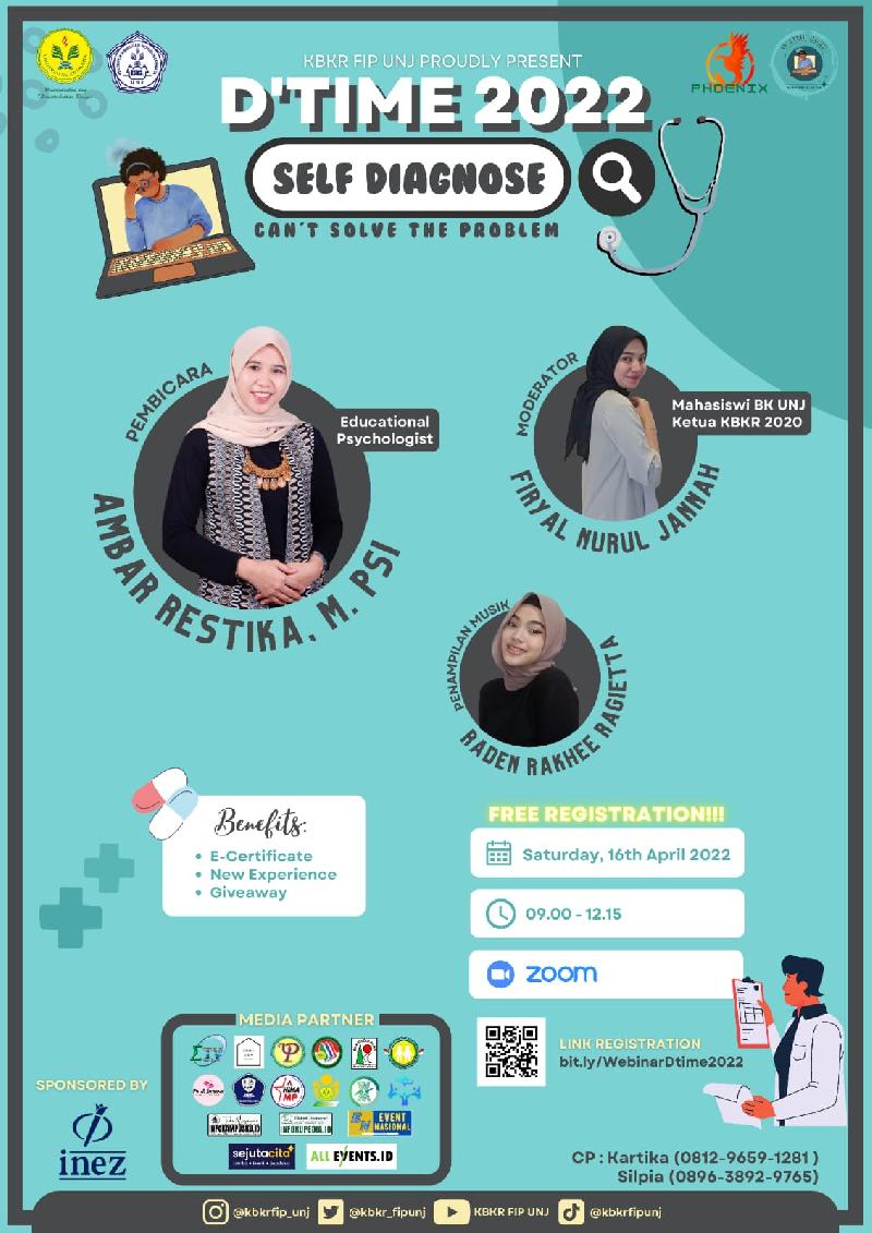 D'time merupakan salah satu webinar nasional yang diadakan oleh KBKR FIP UNJ. Pada tahun ini Dtime mengangkat tema webinar "self diagnose" dengan judul ✨"self diagnose can't solve the problem"✨.
