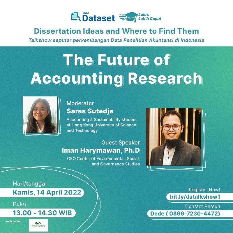 Mengangkat judul, "The Future of Accounting Research", talkshow by ESGI Dataset kali ini akan diisi oleh pak Iman Harymawan, Ph.D selaku CEO CESGS dan dipandu oleh Saras Sutedja, alumni Community Officer yang juga seorang mahasiswa Accounting & Sustainability student di Hong Kong University of Science & Technology