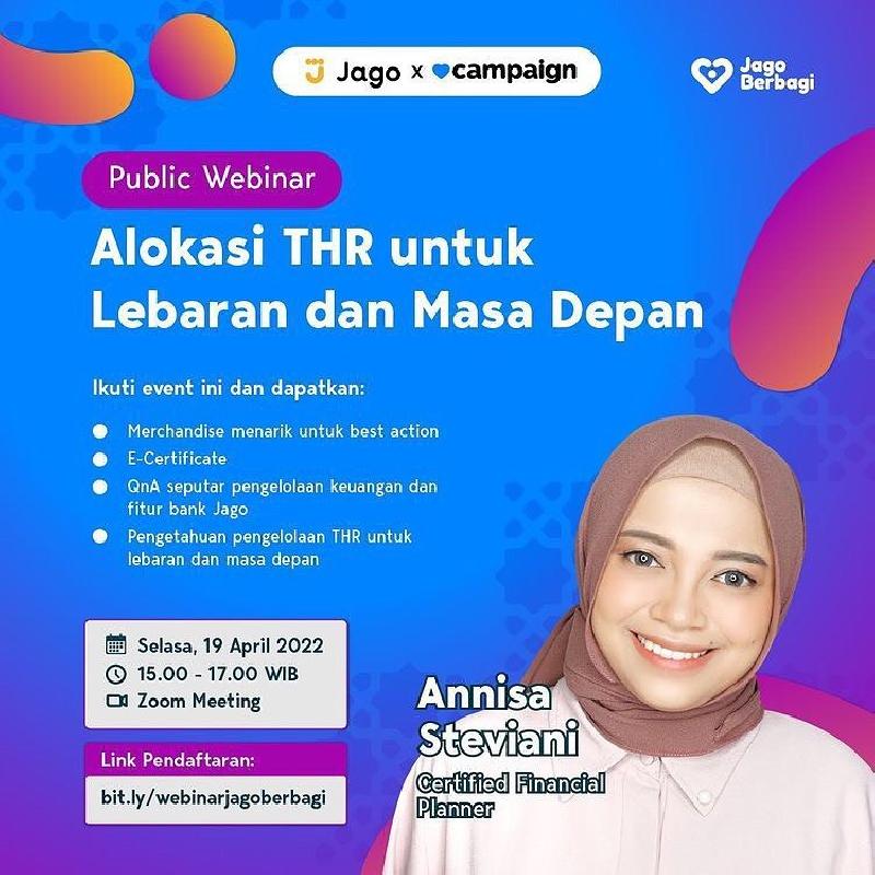 Yuk, ikuti webinar “Alokasi THR untuk Lebaran dan Masa Depan” oleh @jadijago dan @campaign_id untuk kepoin cara mengelola keuangan dan THR dari Kak @annisast !