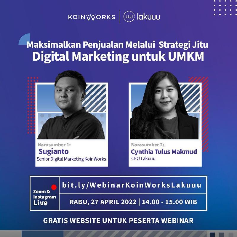 Digital Presence membantu pelaku bisnis meningkatkan target penjualan yang tinggi dengan strategi digital yang dapat digunakan dari berbagai platform online. KoinWorks sebagai salah satu super financial platform bersama dengan Lakuuu Indonesia akan membahas potensi dan pentingnya akselerasi digital untuk UMKM, dalam webinar: