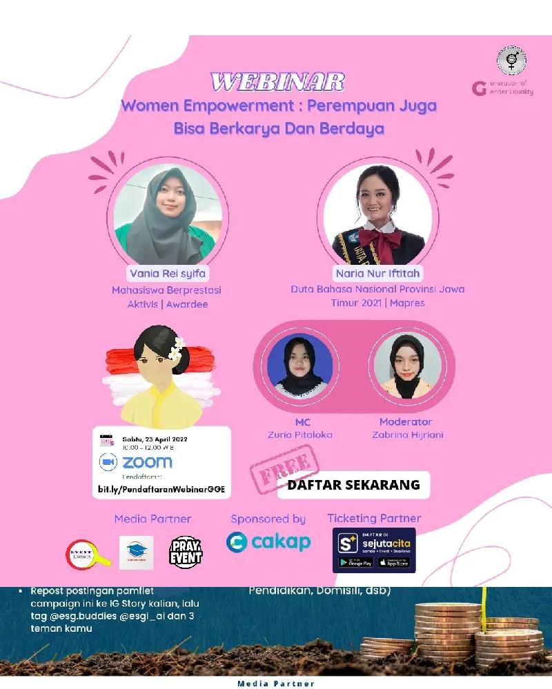 Dalam rangka memperingati Hari Kartini 2022, Generation of Gender Equality mengadakan Webinar Nasional "Women Empowerment : Perempuan Juga Bisa Berkarya Dan Berdaya"