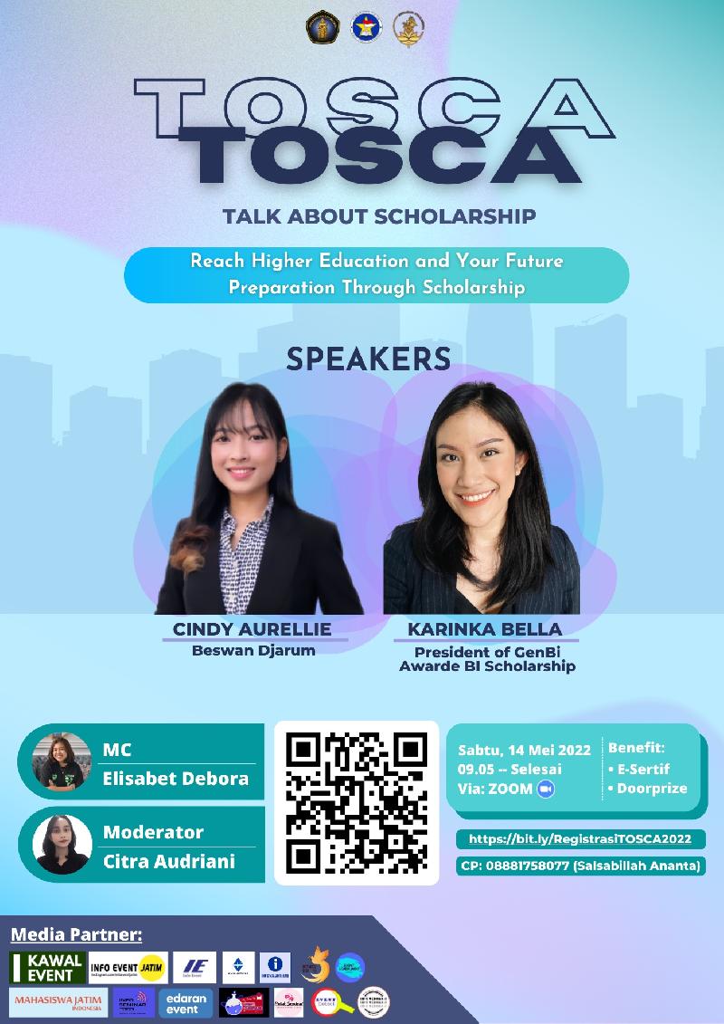 Mempersiapkan masa depan bukanlah sesuatu yang mudah, apalagi ketika kita menginginkan masa depan yang gemilang. TOSCA 2022 hadir membawakan tema "Reach Higher Education and Your Future Preparation Through Scholarship” yang akan membantu kamu menjemput kesuksesanmu, tentunya dengan narasumber yang keren