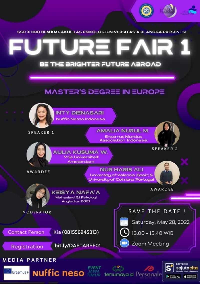 Tenang aja! Departemen SSD X HRD BEM Psikologi Unair mempersembahkan "Future Fair I: Be The Brighter Future Abroad" yang akan membahas terkait studi S2 di luar negeri bersama Erasmus+ dan Nuffic Nesso!