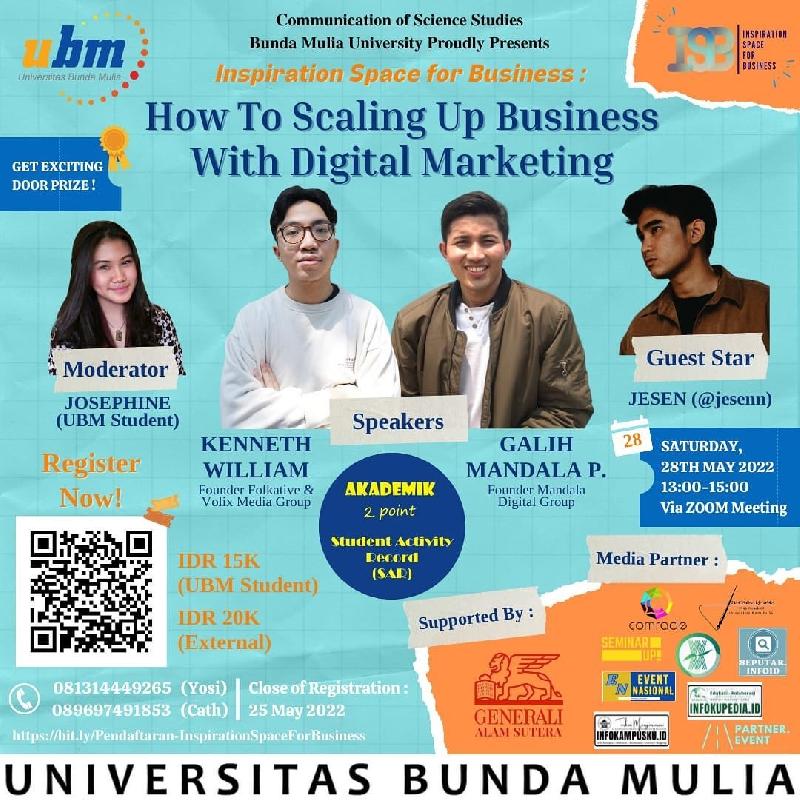 Nah, buat kamu yang pengen belajar gimana cara meningkatkan bisnis dengan digital marketing, webinar ini pas banget buat kamu! Inspiration Space for Business akan mengadakan webinar dengan judul, "How to Scaling Up Business with Digital Marketing"
