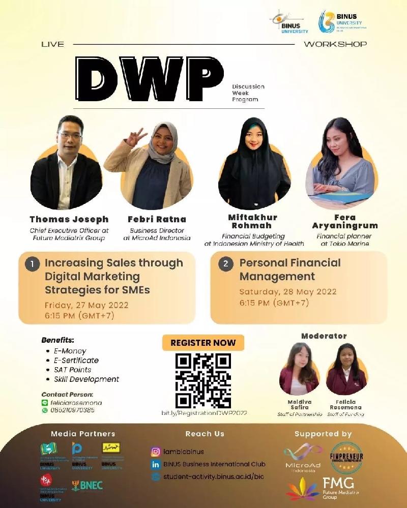 DWP merupakan program rutin BIC untuk membahas topik-topik yang dibutuhkan oleh mahasiswa. DWP ini bertujuan untuk memberikan suatu wawasan lebih mengenai peran penting marketing dalam suatu bisnis, dan bagaimana cara untuk mengelola suatu aset yang mereka miliki dan dapat digunakan dengan baik. Oleh karena itu, kami mengajak kalian semua untuk bergabung dalam acara yang akan dilaksanakan pada: