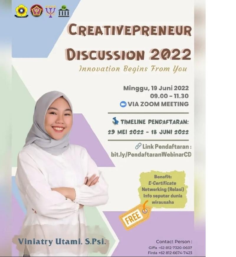 Ingin menjadi seorang entrepreneur tapi bingung mau mulai dari mana ? Mending kamu langsung ikutan acara Bincang Wirausaha deh. Acara Bincang Wirausaha kali ini mengangkat topik “Creativepreneur: Innovation Begins From You”. Yap sesuai namanya, disana kalian akan mendapatkan informasi ataupun wawasan baru dalam bidang bisnis. Kalian juga dapat menyadari pentingnya efikasi diri untuk menjadi seorang entrepreneur dan menyadari bahwa inovasi dalam berwirausaha berasal dari diri sendiri..