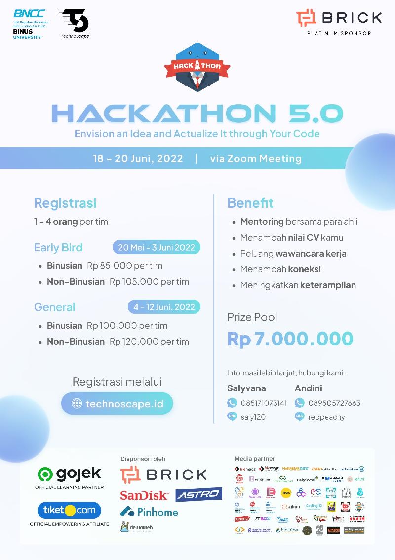 TechnoScape adalah event teknologi terbesar yang diadakan oleh Bina Nusantara Computer Club. TechnoScape menghadirkan tiga rangkaian acara menarik termasuk Hackathon 5.0 bertemakan “Envision an Idea and Actualize It through Your Code.” yang hadir pada tanggal 18 - 20 Juni 2022.