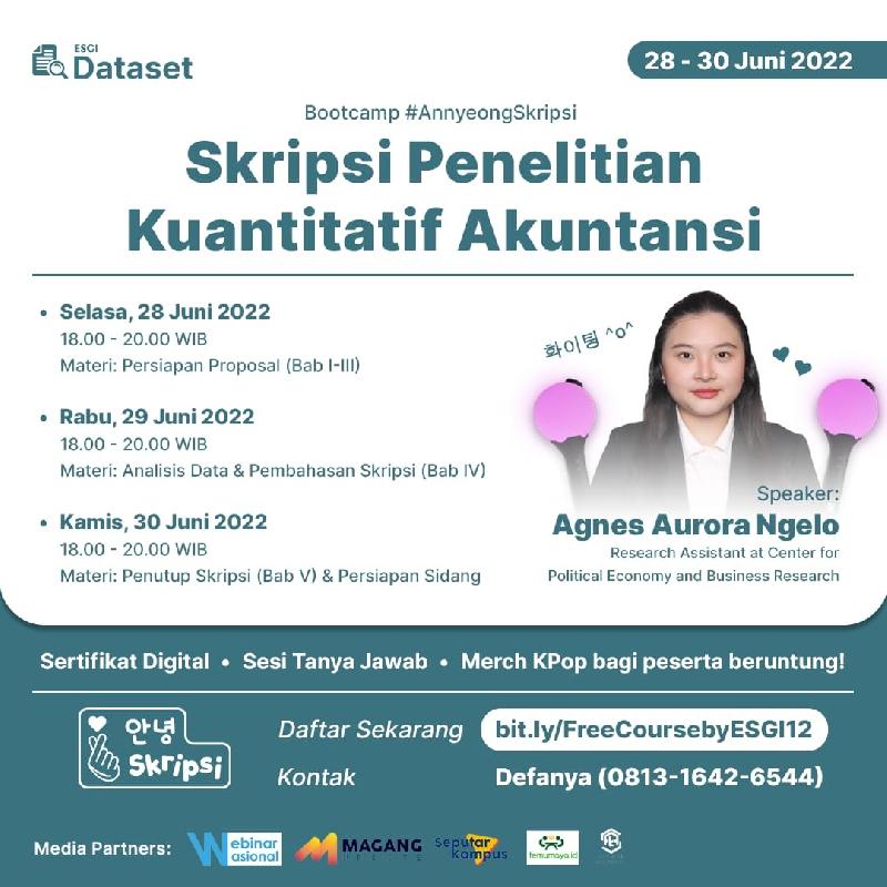 Selama 3 hari kamu bakalan diajarin gimana sih cara nysun Bab 1-5, persiapan sidang sekaligus bisa ngobrolin soal KPOP sambil belajar nyusun skripsi sampai akhirnya bisa bilang Annyeong Skripsi” bersama mba Agnes Aurora Ngelo selaku Research Assistant at Center for Political Economy and Business Research.