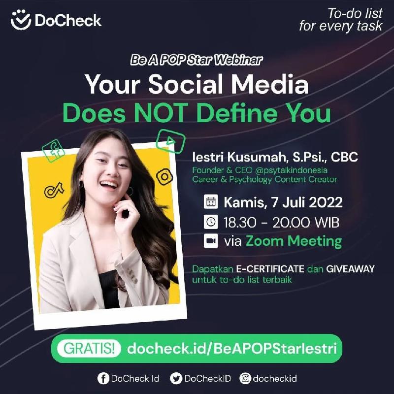 Kamu mau dapet tips dan trik lainnya biar bisa mengontrol diri dalam bersosial media? Yuk ikutan Be A POP Star Webinar "Your Social Media Does NOT Define You" bareng Iestri Kusumah (@iestrikusumah).