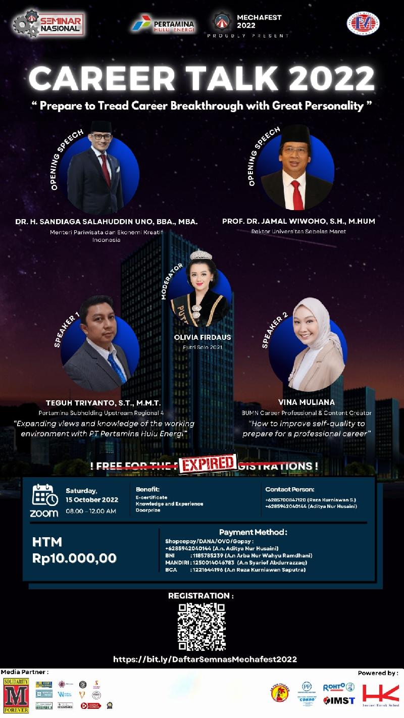 Seminar Nasional Mechafest 2022 dengan tema *"CAREER TALK 2022"* berkesempatan menghadirkan pembicara keren dan tentunya berkompeten di bidangnya. Pembicara yang dihadirkan kali ini bukan sembarang pembicara, tapi tentu pembicara yang unggul dan profesional, yaitu :