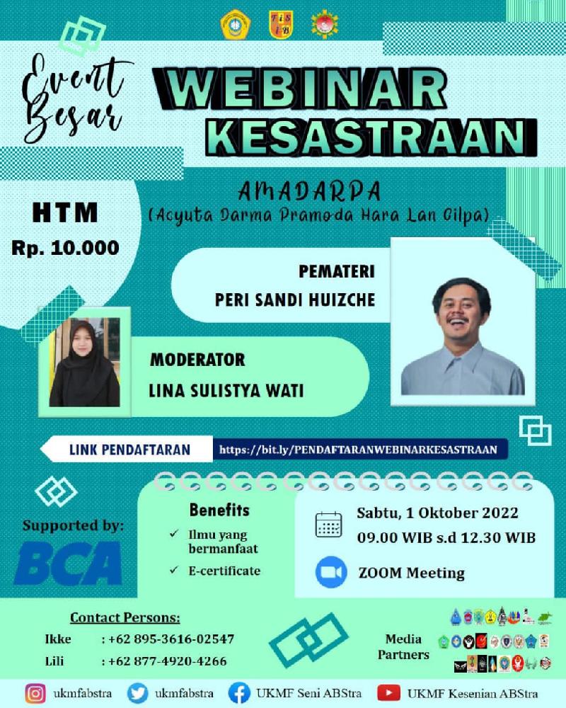 Hallo para penggemar seni sastra! UKMF Kesenian ABStra mengadakan webinar kesastraan nih
